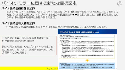 これまでの医療費適正化計画の議論、BS(バイオ後続品)を含む後発医薬品の使用促進についてはこれまでも本ブログで取り上げ、紹介してきた。安定供給を基本としつつ、まだ数量ベースで80%以上を達成できていない都道府県の目標達成を推進しつつ、既に達成できている都道府県に対しては金額ベース等の観点を踏まえた新たな目標設定を令和6年度中に行うこととしている。また、バイオ後続品についても目標値を設定し、今後推進していくことになっている。